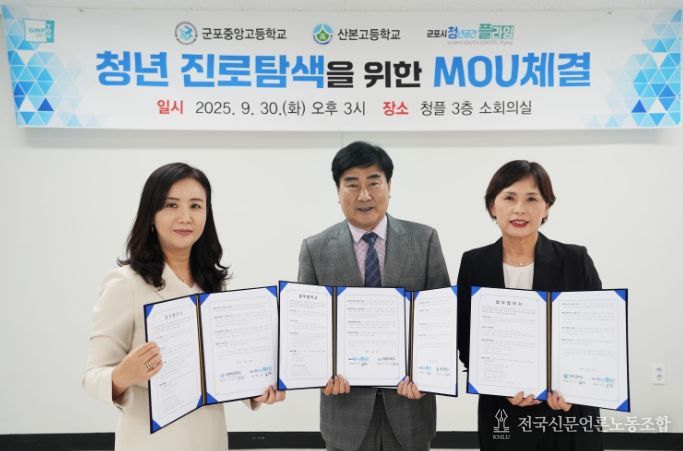 전국신문언론노동조합 기자 | 군포시 청년공간플라잉(센터장 조남)은 지난 9월 30일 군포중앙고(교장 이은경), 산본고(교장 김은정)와 함께 2025 창업스쿨 사업 관련 업무협약을 맺었다.