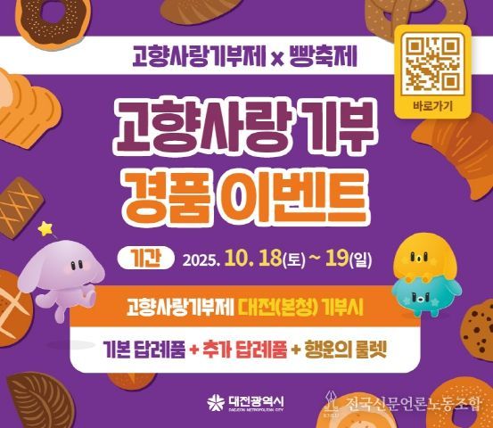 전국신문언론노동조합 강찬희 기자 | 대전시는 오는 10월 18일부터 19일까지 소제동 카페거리와 대동천 일원에서 열리는 ‘2025 대전 빵축제’ 현장에 대전고향사랑기부제 홍보관을 운영한다고 6일 밝혔다.