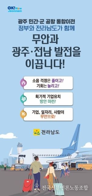 전국신문언론노동조합 김성길 기자 | 전라남도는 전남·광주·무안의 상생과 도민의 오랜 염원을 이루기 위해 광주 민간·군 공항의 무안국제공항 통합이전을 ‘더 이상 미룰 수 없는 시대적 과제’로 규정하고 강력히 추진할 계획이라고 밝혔다.