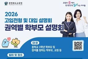 전국신문언론노동조합 김성길 기자 | 충청북도교육청은 14일부터 23일까지 학부모 대상 찾아가는 2026. 고입전형 및 대입 설명회를 실시한다고 밝혔다.
