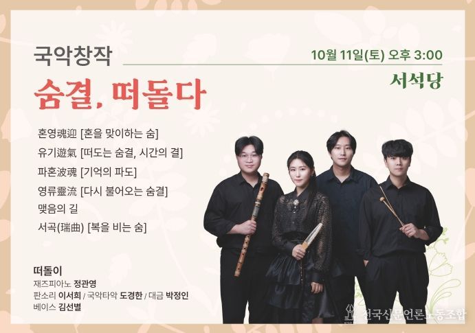 전국신문언론노동조합 기자 | 광주문화재단(대표이사 노희용) 전통문화관은 오는 10월 11일 오후 3시, 토요 상설공연 22회차로 퓨전국악 단체 떠돌이의 '숨결, 떠돌다' 무대를 선보인다.