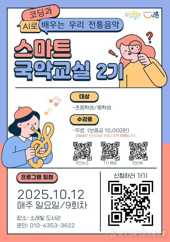 이 프로그램은 블록코딩과 인공지능(AI)을 접목해 국악기를 직접 제작하고 연주할 수 있도록 구성됐다. 어린이와 청소년들에게 전통음악과 디지털 융합 경험을 동시에 제공하는 과정으로, 지난 여름방학 특강에서도 참여 학생들의 큰 호응을 얻은 바 있다.