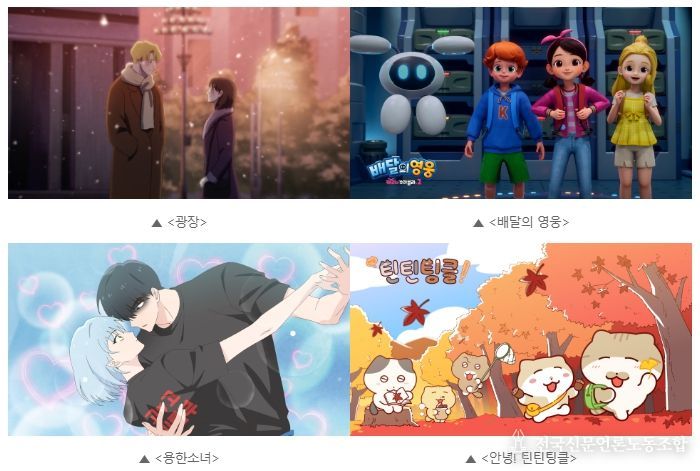 이번 상영작은 국내·외에서 주목받은 화제작들이 다채롭게 상영된다. 제49회 안시국제애니메이션영화제 ‘콩트르샹’ 부문 수상작인 김보솔 감독의 장편 애니메이션 '광장'을 비롯해, 온 가족이 함께 즐길 수 있는 뮤지컬 애니메이션이자 대표적인 K-키즈 콘텐츠인 ‘캐리’ 시리즈의 두 번째 극장판 '배달의 영웅'이 상영된다. 또한 네이버 웹툰 원작을 바탕으로 라프텔에서 오리지널 애니메이션으로 제작된 '용한소녀', 고양이 캐릭터들의 우애와 가족애를 따뜻하게 그린 '안녕! 틴틴팅클'도 함께 만나볼 수 있다.