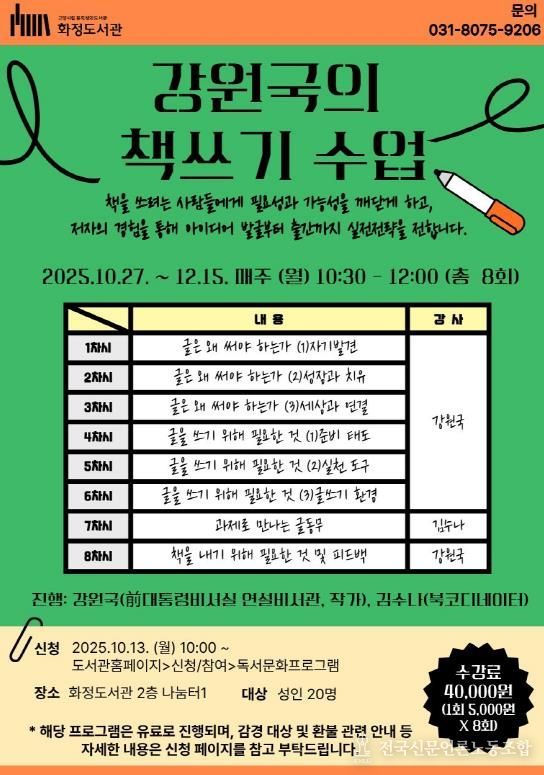 전국신문언론노동조합 기자 | 고양특례시는 10월 27일부터 12월 15일까지 매주 월요일 오전 10시 30분부터 12시까지, 화정도서관 2층 나눔터1에서 ‘강원국의 책쓰기 수업’프로그램을 운영한다고 밝혔다.