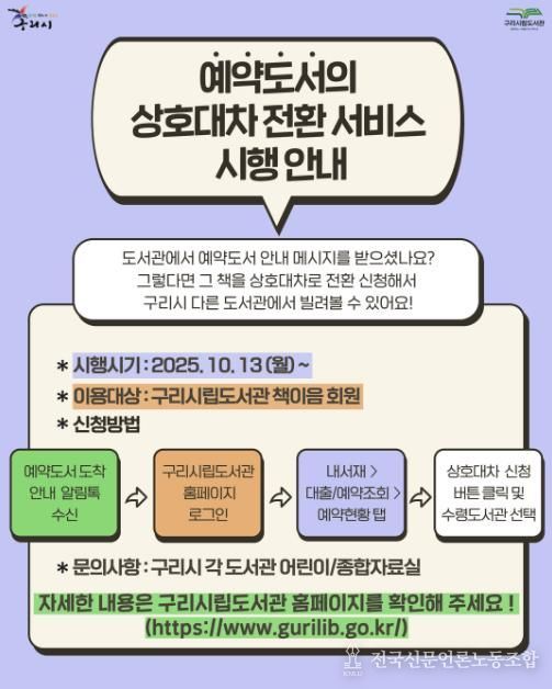 전국신문언론노동조합 기자 | 구리시는 오는 10월 13일부터 시민들의 도서 이용 편의성을 높이기 위해‘시립도서관 예약 도서 상호대차 전환 서비스’를 새롭게 운영한다고 밝혔다.