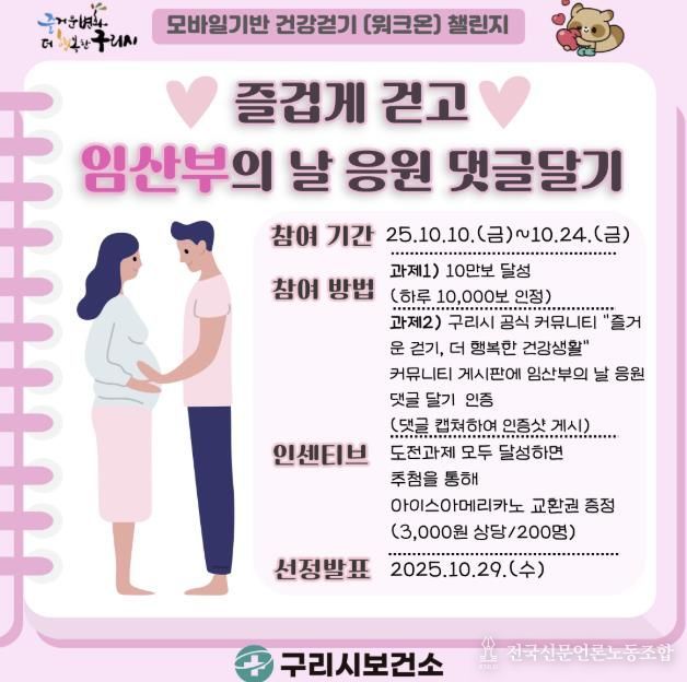 전국신문언론노동조합 기자 | 구리시는 제20회‘임산부의 날’(10월 10일)을 기념해 임신과 출산의 가치를 되새기고 시민 건강 증진을 도모하기 위한 ‘즐겁게 걷고, 임산부의 날 응원 댓글 달기’ 챌린지를 오는 10월 10일부터 24일까지 15일간 운영한다고 밝혔다.