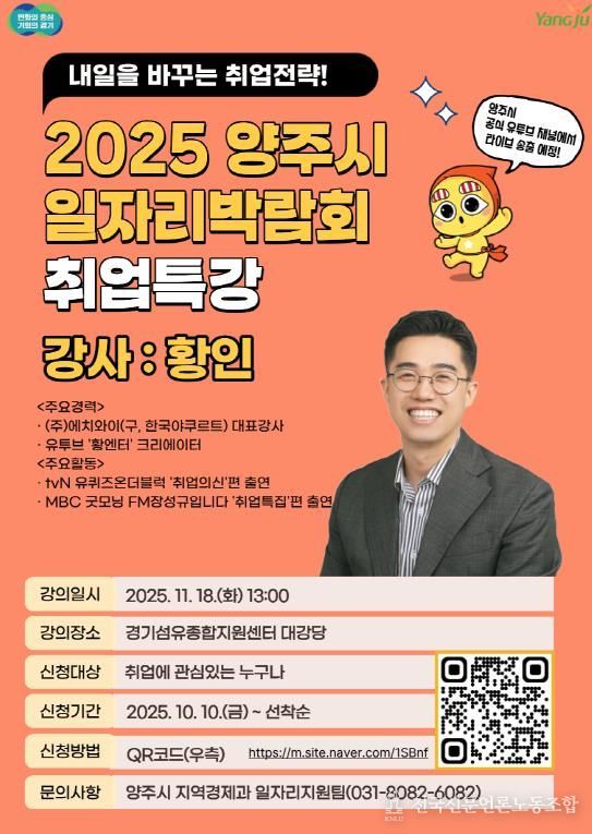 전국신문언론노동조합 기자 | 양주시가 오는 11월 18일 오후 1시, 경기섬유종합지원센터 대강당(지하 1층)에서 ‘2025 양주시 일자리박람회 취업특강’을 개최한다.