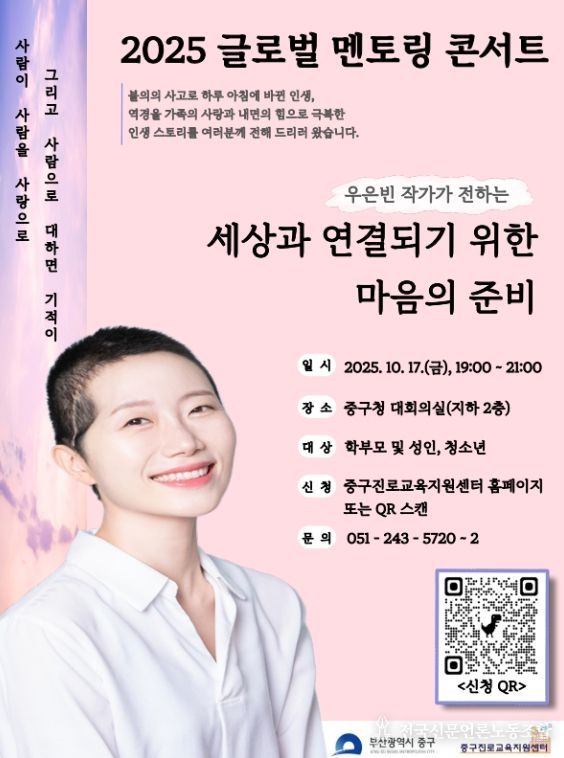 전국신문언론노동조합 조창제 기자 | 부산 중구는 중구 진로교육지원센터 주관으로 오는 10월 17일 오후 7시, 중구청 지하2층 대회의실에서 '2025 글로벌 멘토링 콘서트'를 개최한다.