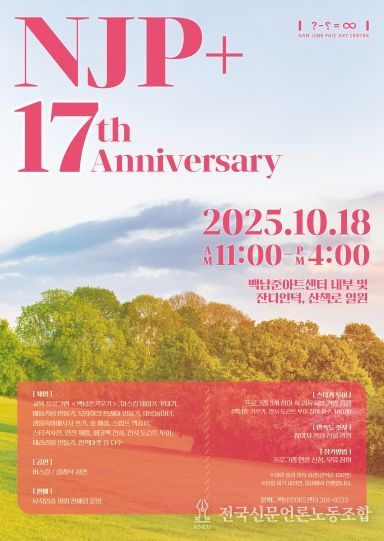 전국신문언론노동조합 강찬희 기자 | 경기문화재단 백남준아트센터(NJP, 관장 박남희)는 2025년 10월 18일, 개관 17주년 기념 축제 'NJP+'를 연다. 특히 이번 행사는 백남준아트센터와 경기도박물관, 경기도어린이박물관으로 이어지는 산책로 환경개선과 맞물려 축하의 의미를 더하고 있다. 아트센터는 올해 시민 예술 교육프로그램인 ‘퍼블릭 아카데미’ 운영, 지역 연계 협력 축제인 ‘제8회 머내마을영화제’ 공동체 상영관 참여, 유휴부지에 공유 정원을 조성하는 ‘이키로(2km) 정원행동 캠페인’ 등 지역과 환경을 잇는 새로운 고객서비스 프로그램을 기획·추진하고 있다.