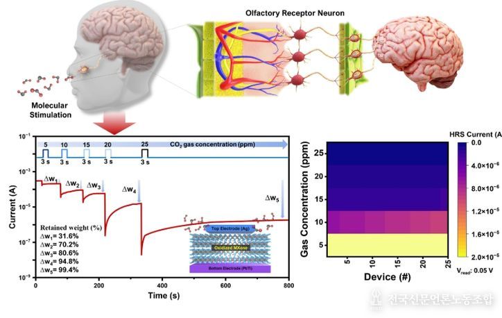 전국신문언론노동조합 강찬희 기자 | 경상국립대학교공과대학 나노신소재융합공학과 박준홍 교수(생체모방 반도체 연구실) 연구팀은, 인간의 후각과 두뇌를 모방하여 다양한 환경에서 발생 가능한 극미량의 유해원을 인지하고 학습하는 뉴로모픽 반도체 기술을 개발했다.