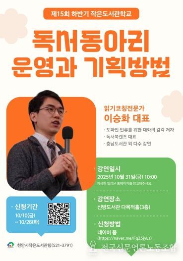 전국신문언론노동조합 강찬희 기자 | 천안시는 오는 31일 신방도서관에서 ‘제15회 하반기 작은도서관학교’를 운영한다고 13일 밝혔다.