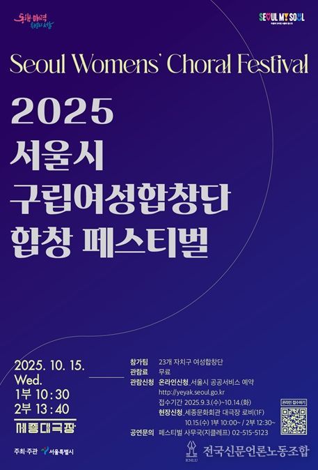 전국신문언론노동조합 강찬희 기자 | 서울시는 깊어가는 가을을 맞아 오는 10월 15일 오전 10시 30분부터 세종문화회관 대극장에서 '2025 서울시 구립여성합창단 합창 페스티벌'을 개최한다. 이번 페스티벌에는 서울시 23개 자치구 여성합창단 700여 명이 무대에 올라, 아름다운 화음으로 시민들에게 잊지 못할 감동과 따뜻한 추억을 선사할 예정이다.