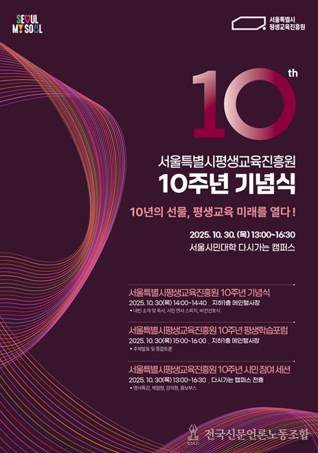 전국신문언론노동조합 강찬희 기자 | 서울시평생교육진흥원이 설립 10주년을 맞아 오는 10월 30일 서울시민대학 다시가는 캠퍼스에서 '서울시평생교육진흥원 10주년 기념식'을 개최한다. 이번 행사는 지난 10년의 성과를 되짚고 미래 비전을 제시하는 자리를 넘어, 시민이 직접 참여하고 즐기는 다채로운 축제의 장으로 마련된다.