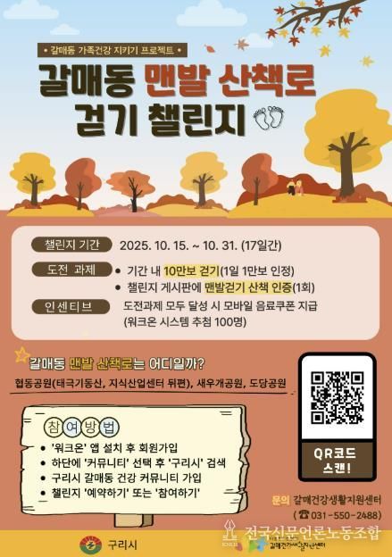 전국신문언론노동조합 기자 | 구리시는 가을철 주민들의 건강한 생활 습관 형성과 스트레스 완화를 위해 ‘갈매동 맨발 산책로 걷기 챌린지’를 오는 10월 15일부터 31일까지 17일간 운영한다고 밝혔다.