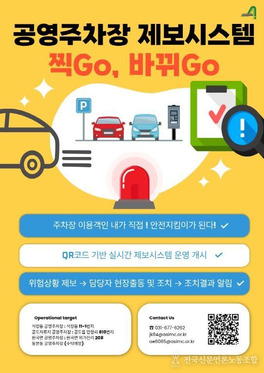전국신문언론노동조합 기자 | 안성시시설관리공단은 10월 10일부터 원곡면, 석정동, 공도 저류지, 동본동(수탁예정)공영주차장 4개소 대상으로, 이용객이 직접 주차장의 위험요소나 이용 불편사항을 손쉽게 제보하고 개선에 참여할 수 있는 QR 코드 기반의 실시간 위험상황 제보시스템 “찍Go, 바뀌Go”를 운영한다고 밝혔다.