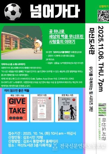 전국신문언론노동조합 기자 | 마산도서관은 오는 11월 6일 19시, 본관 3층 다목적실에서 ‘공 하나로 세상의 벽을 무너뜨린 사람들의 이야기’ 프로그램을 운영한다고 밝혔다.