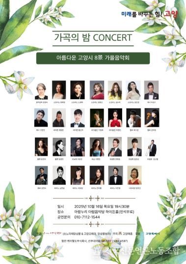전국신문언론노동조합 기자 | 고양특례시가 후원하고, (사)한국예술문화단체총연합회 고양지회가 주최하며 (사)한국음악협회 고양지부가 주관하는 ‘2025 가곡의 밤 – 아름다운 고양시 8경(景) 가을 음악회’가 오는 16일 오후 7시 30분, 고양아람누리 아람음악당에서 개최된다.