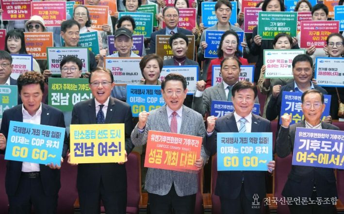 전국신문언론노동조합 김성길 기자 | 전라남도는 14일 여수 진남문예회관에서 ‘2026년 유엔기후변화협약 기후주간’ 국내 개최지 공모에 여수가 선정된 것을 축하하고, 행사 성공개최를 다짐하는 기념행사를 열었다.