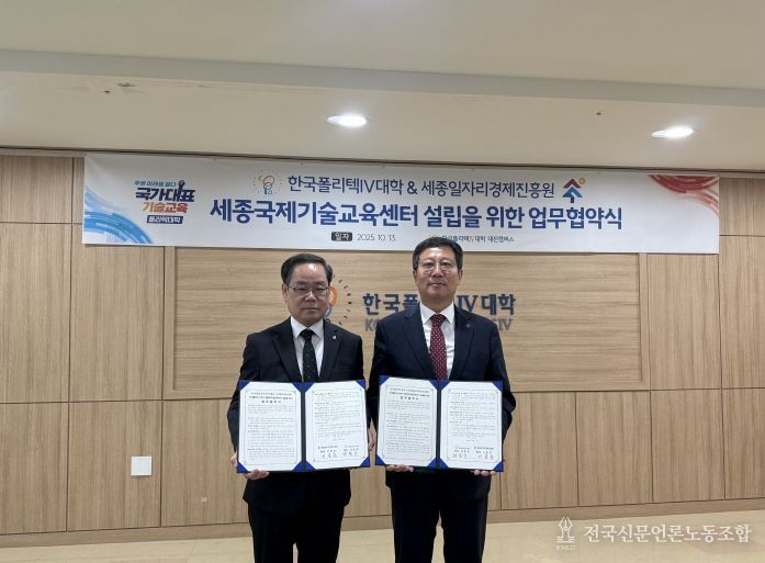 전국신문언론노동조합 강찬희 기자 | 세종일자리경제진흥원과 한국폴리텍Ⅳ대학은 13일 한국폴리텍Ⅳ대학 대전캠퍼스에서 ‘세종국제기술교육센터’ 설립 및 운영을 위한 업무협약을 체결했다.