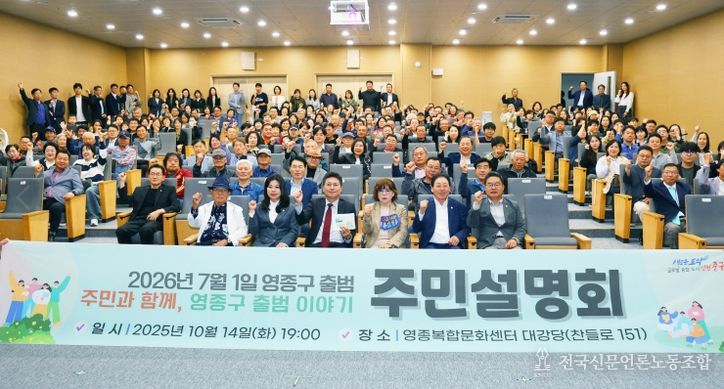 전국신문언론노동조합 강찬희 기자 | 인천 중구의회는 10월 14일 오후 7시, 영종복합문화센터 대강당에서 열린 '주민과 함께, 영종구 출범 이야기' 주민설명회에 참석해 지역주민과 함께 성공적인 영종구 출범을 위한 비전과 방향을 공유했다.