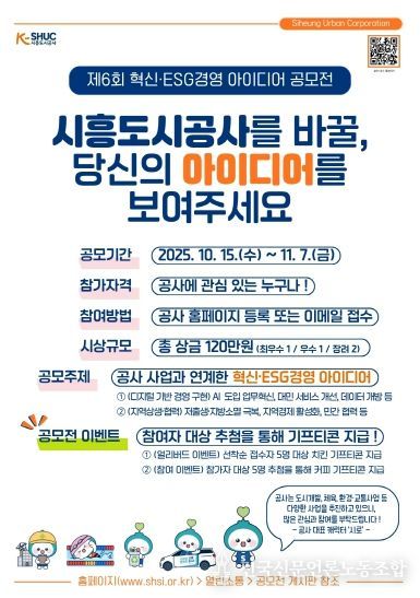 전국신문언론노동조합 기자 | 시흥도시공사는 10월 15일부터 11월 7일까지 ‘제6회 시흥도시공사 혁신·ESG경영 아이디어 공모전’을 개최한다.