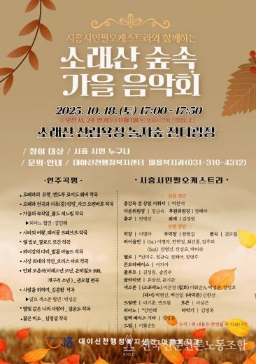 전국신문언론노동조합 기자 | 시흥시 대야ㆍ신천행정복지센터는 오는 10월 18일 소래산 삼림욕장 놀자숲 잔디광장에서 대야ㆍ신천동 지역 주민을 위한 ‘소래산 숲속 가을 음악회’를 개최한다.