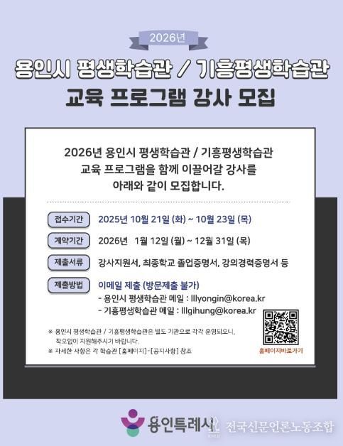 전국신문언론노동조합 기자 | 용인특례시는 21일부터 23일까지 3일간 ‘2026년 평생학습관 프로그램’을 운영할 강사를 모집한다고 15일 밝혔다.