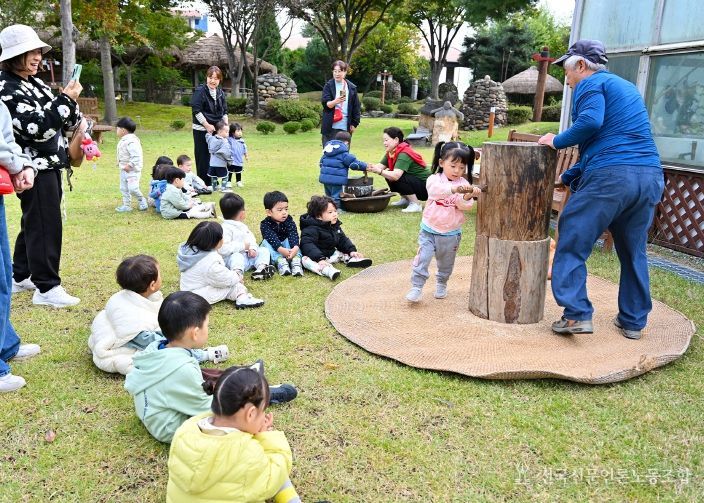 첫날인 21일에는 청주시 소재 어린이집 원아들이 직접 벼이삭을 털고 허수아비 바람개비를 만드는 등 즐겁고 활기찬 분위기 속에서 전통 농경문화를 배우는 시간을 가졌다.