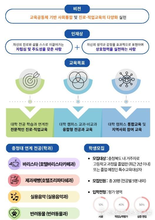 충북교육청은 캠퍼스 융합형 전공과 운영을 위해 지난 9월 충청대학교와 업무협약을 시작으로 10월 신입생 모집과 선발 전형을 완료해 2026학년도부터 본격적인 운영을 준비하고 있다.