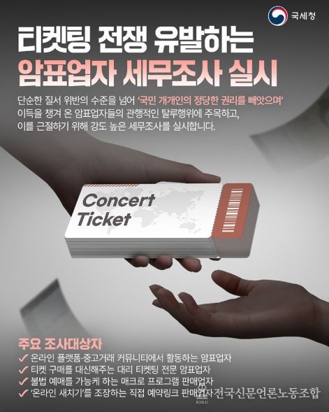 전국신문언론노동조합 관리자 기자 | 단순한 질서 위반의 수준을 넘어 '국민 개개인의 정당한 권리를 빼앗으며' 이득을 챙겨 온 암표업자들의 관행적인 탈루행위에 주목하고, 이를 근절하기 위해 강도 높은 세무조사를 실시합니다.