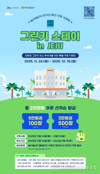 할인 대상은 제주지역 그린키 인증 숙소로 한정되며, 투숙 가능 기간은 2026년 1월 31일까지다.
