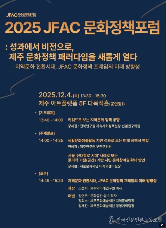 전국신문언론노동조합 김성길 기자 | 제주문화예술재단(이사장 김석윤)은 '다시 심는 성과, 피어나는 비전'이라는 슬로건으로 '2025년 재단 성과공유주간(이하 성과공유주간)'을 개최한다. 프로그램은 제주아트플랫폼(5층)에서 12월 4일부터 6일까지 3일간 진행된다.