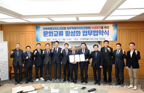 전국신문언론노동조합 김성길 기자 | 제주특별자치도의회는 12월 1일 오후 14시 전북특별자치도의회 의장실(의장 문승우)에서 전북특별자치도의회와 문화교류 활성화 및 지역 상생발전을 위한 업무협약(MOU)을 체결했다고 밝혔다.