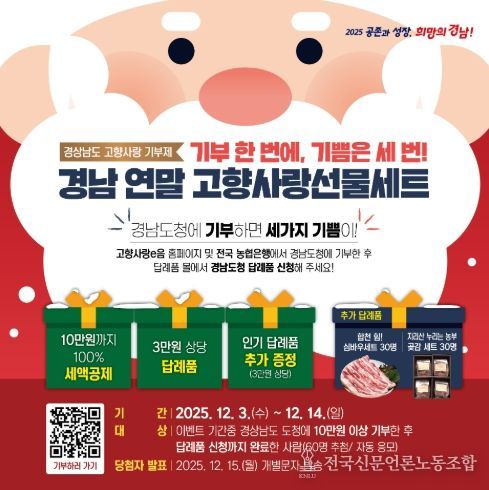 전국신문언론노동조합 강찬희 기자 | 경상남도는 연말정산 시즌을 맞아 12월 3일부터 14일까지 12일간 ‘고향사랑기부제 연말 특별 이벤트’를 진행한다.