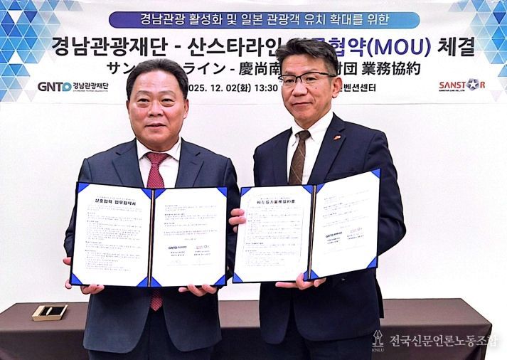 전국신문언론노동조합 강찬희 기자 | 경남관광재단은 12월 2일 창원컨벤션센터에서 팬스타그룹 일본 현지법인인 ‘산스타라인(SANSTAR LINE)’과 ‘경남 관광 활성화 및 일본 관광객 유치 확대’를 위한 업무협약(MOU)을 체결했다고 밝혔다.