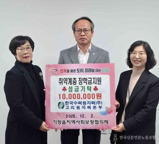 전국신문언론노동조합 이의용 기자 | 기장군 행정복지센터는 지난 2일 ㈜한국수력원자력 고리원자력본부, 기장읍 지역사회보장협의체(민간위원장 권묘연)와 함께 지역 내 취약계층 학생을 위한 장학금 기탁식을 개최했다고 3일 밝혔다.