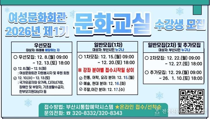 전국신문언론노동조합 조창제 기자 | 부산시 여성문화회관은 오는 내일(8일)부터 '2026년 제1기 문화교실' 수강생을 모집한다고 밝혔다.