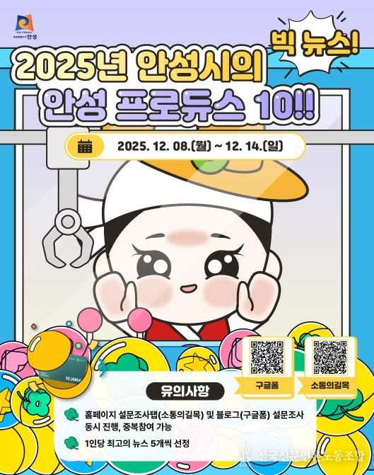 전국신문언론노동조합 기자 | 안성시는 8일부터 14일까지 7일간 ‘2025년을 빛낸 안성시 10대 뉴스’ 선정을 위한 온·오프라인 시민 투표를 진행한다고 밝혔다.