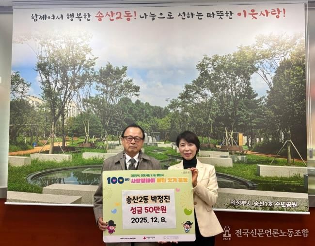 전국신문언론노동조합 기자 | 의정부시 송산2동주민센터는 12월 8일 지역 주민 박정진 씨가 취약계층 지원을 위해 성금 50만 원을 기탁하며 ‘100일간 사랑릴레이 배턴 잇기’에 동참했다고 밝혔다.