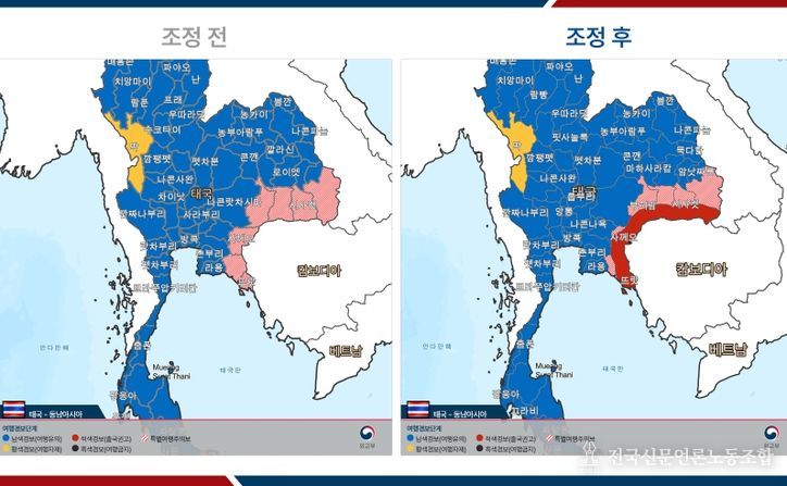 지난 7월 발령한 양국 접경 지역에 대한 특별여행주의보는 계속 유지되며, 해당 특별여행주의보 발령 지역 중 태국-캄보디아 국경으로부터 50km 이내에 있는 양국 지역을 각각 3단계(철수권고)로 상향 조정한다.