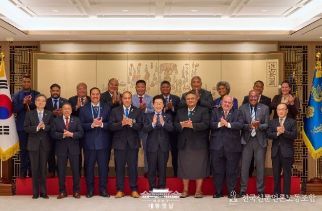 전국신문언론노동조합 강찬희 기자 | 이재명 대통령은 12월 10일 오전, 대통령실에서 제6차 한-태평양도서국 외교장관회의 참석을 위해 방한한 태평양도서국 외교장관 일행을 접견했다.