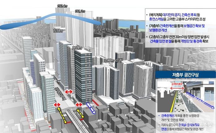 우선, 청년층 유입이 활발한 대학 주변 환경을 고려해 로데오거리를 청년특화거리로 변화시키고, 안전하고 특색있는 보행환경을 위해 건축선 계획과 지역특화 권장용도 계획을 연계한 허용용적률 인센티브를 함께 재정비했다.