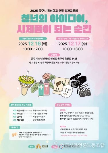 전국신문언론노동조합 강찬희 기자 | (재)충남창조경제혁신센터는'2025년 예비청년 특화사업 성장지원(교육특구 시범사업)'의 일환으로 추진 중인 특성화고 창업동아리 프로그램의 성과를 시민들과 공유하기 위해 ‘2025 특성화고 연말 성과교류회’를 12월 16일부터 17일까지 지역 청년센터에서 개최한다고 밝혔다.