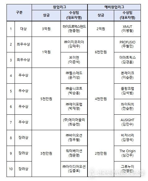 그 외에도 이지코리아, 브이엔은 창업리그 최우수상을, PROFUSIO(프로퓨지오), 더마트릭스는 예비창업리그 최우수상을 수상하는 등 총 20개 팀이 수상의 영예를 안았다.