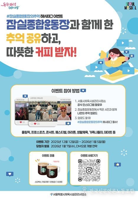 전국신문언론노동조합 강찬희 기자 | 서울시 체육시설관리사업소는 잠실종합운동장에서 시민이 경험한 다양한 추억과 기억을 수집하기 위한 SNS 이벤트 '#잠실종합운동장의 추억 해시태그 이벤트'를 2026년 1월 5일까지 진행한다고 밝혔다.