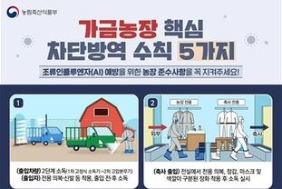 김 지사는 특히 '내 농장은 내가 지킨다'는 인식이 농가에 뿌리내릴 수 있도록 자율 방역과 차단방역 5대 수칙 준수를 지속 홍보해 달라고 강조했다. 차단방역 5대 수칙은 출입 차량 2단계 소독, 축사 출입 시 전용 복장 착용, 부출입구 폐쇄, 농장 내외부 매일 소독, 야생동물 침입 차단 등이다. 폐사가 늘거나 산란율이 떨어지는 등 이상 증상이 확인되면 방역당국에 즉시 신고해야 한다.