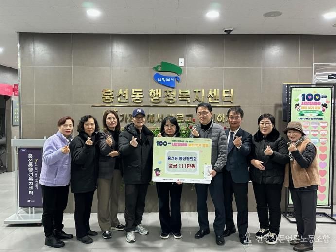 전국신문언론노동조합 기자 | 의정부시 흥선동 행정복지센터는 12월 16일 흥선동통장협의회가 ‘100일간 사랑릴레이 배턴 잇기’에 동참해 관내 어려운 이웃들을 위한 성금 111만 원을 기탁했다고 밝혔다.