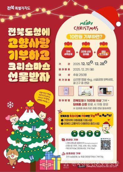이지형 전북자치도 대외협력과장은 “고향사랑기부제는 연말정산 세액공제 혜택과 함께 지역 변화에 직접 참여할 수 있는 의미 있는 제도”라며 “도와 시·군이 준비한 다양한 연말 이벤트를 계기로 더 많은 국민이 전북 고향사랑기부에 동참해 주길 바란다”고 말했다.