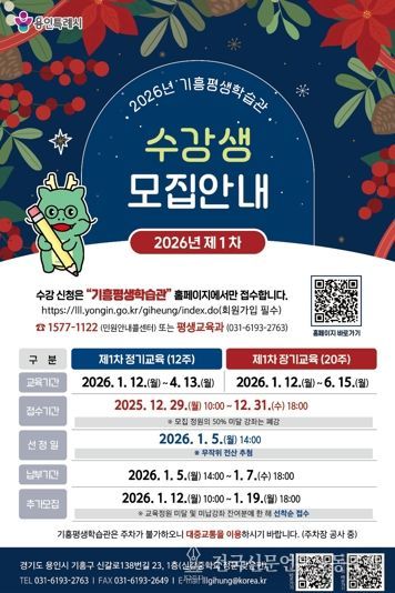 전국신문언론노동조합 기자 | 용인특례시 기흥평생학습관은 29일부터 31일까지 생성형 인공지능(AI), 웃음치료사, 영어 등 ‘2026년 제1차 정기·장기교육’ 수강생을 모집한다고 21일 밝혔다.