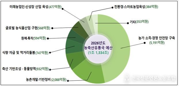 전국신문언론노동조합 강찬희 기자 | 경상북도는 농축산유통 분야 2026년 예산안을 전년(1조 1,096억원) 대비 2.15%(238억) 증가한 1조 1,334억원 규모로 편성했다고 밝혔다.